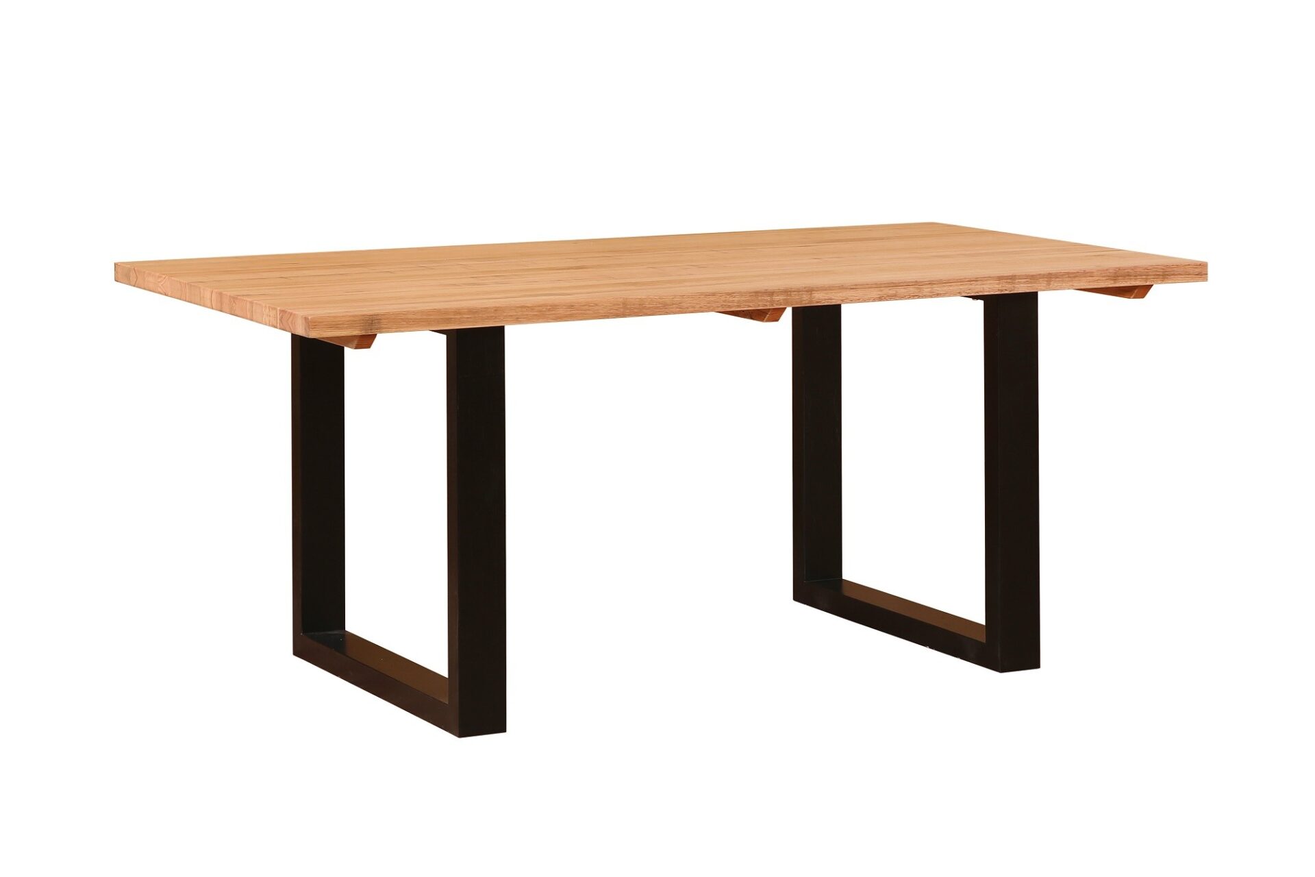 Sturdily crafted from solid Tassie Oak, This large 200cm long dining table is made from Australian Tassie Oak timber and has a rough sawn finish, statement angled legs made of black powder-coated metal.