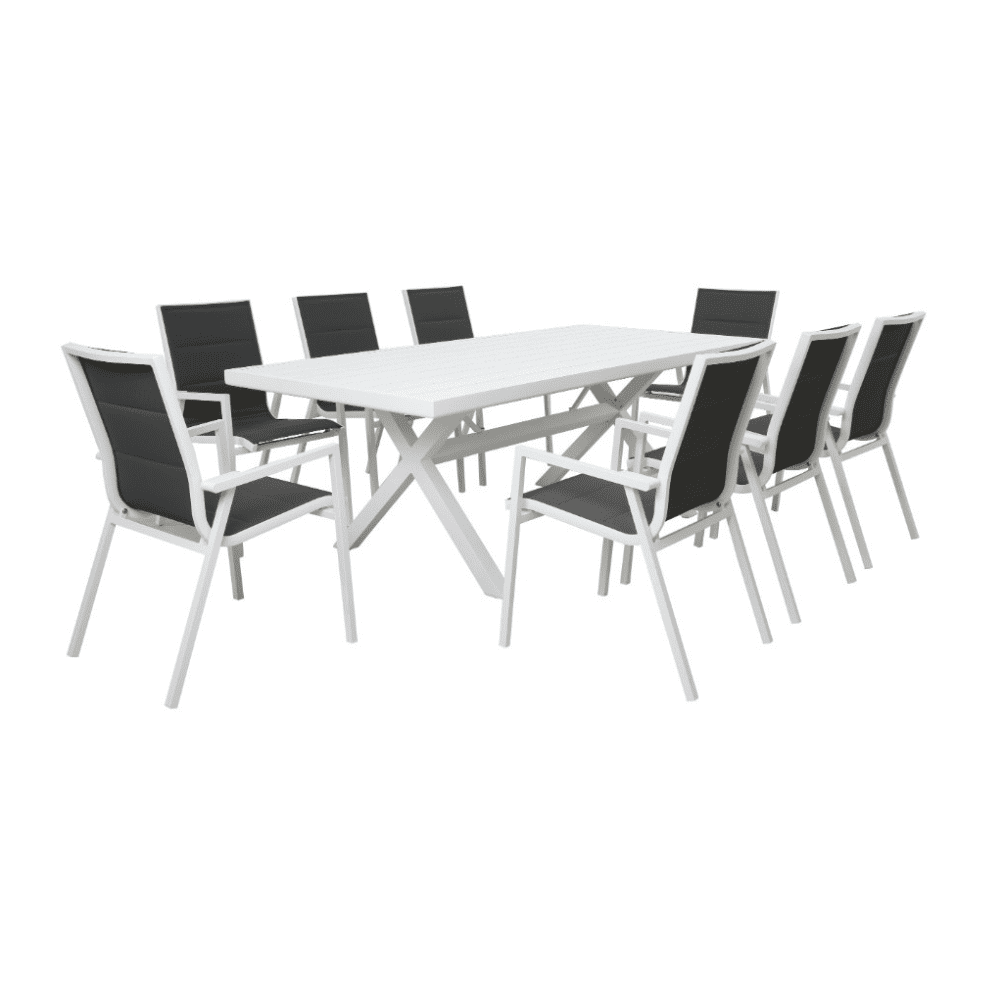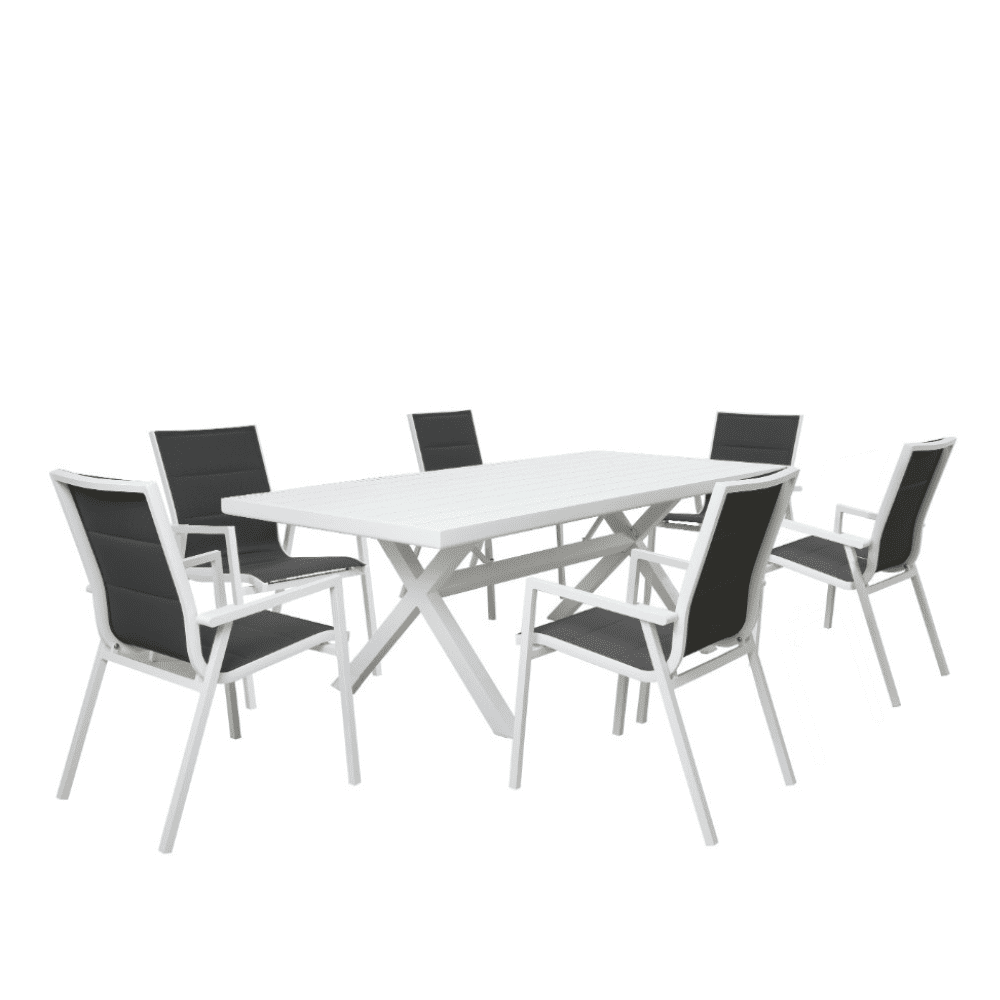 The Balgo Outdoor dining chairs are equipped with padded textilene seats for added comfort, making each meal a more enjoyable experience. These chairs are also designed to stack for easy storage, making the set both practical and space-efficient when not in use.
