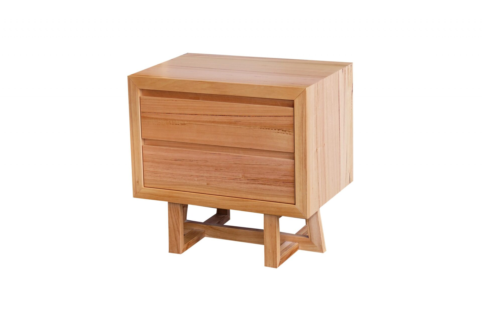 Sturdily crafted from solid messmate, this on trend Bed side table has a stylish and statement angled legs with 2 roomy draws made of solid messmate. Case goods from the same ranges is also available, sold separately.