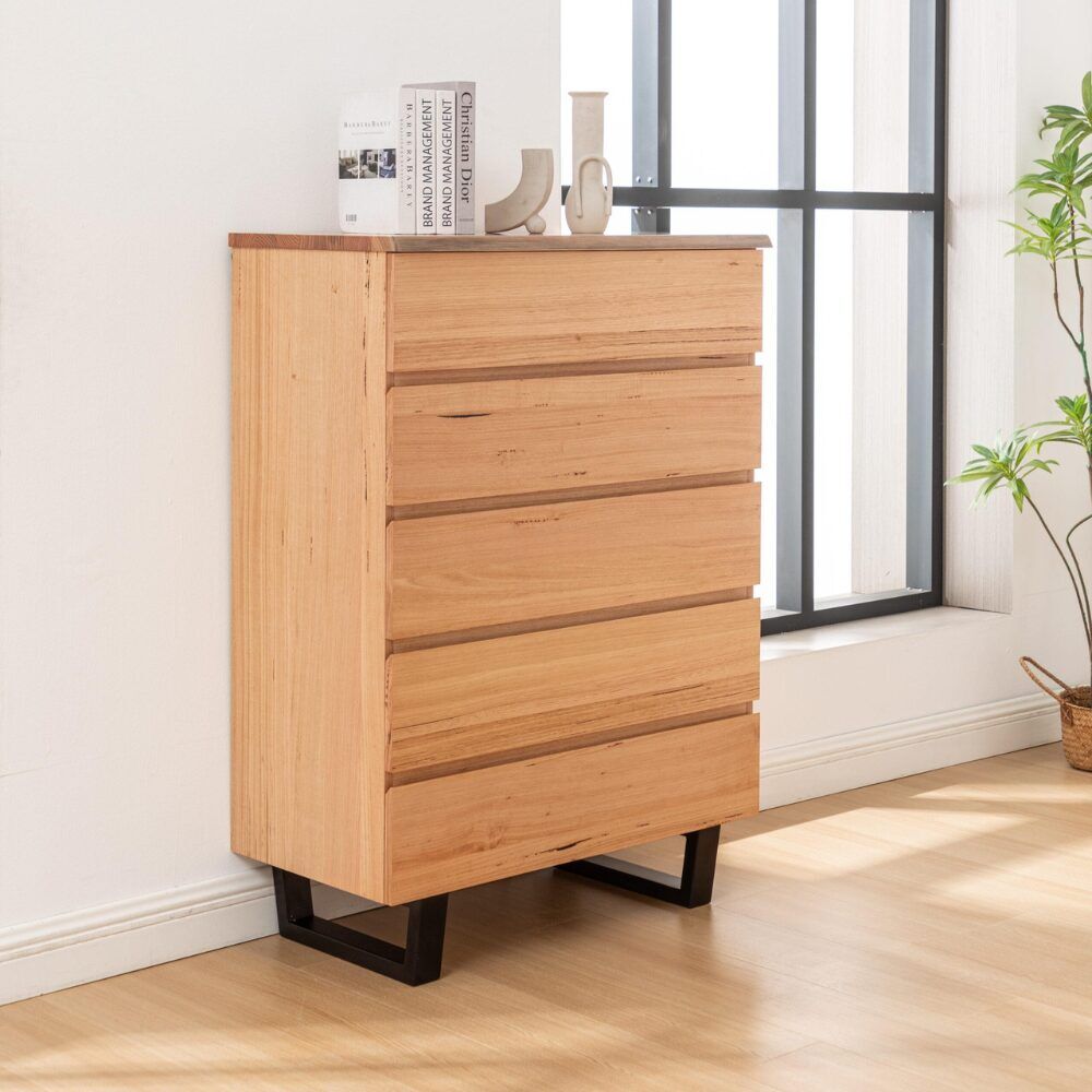Ella 5 draws Tallboy is Crafted from the finest Messmate timber, the timber bedframe stands as a beacon of elegance and durability in any bedroom. Its design embodies a harmonious blend of rustic charm and modern sophistication, making it a versatile centrepiece that complements a wide range of interior styles. Full ranges of Ella bedroom is available, sold separately.