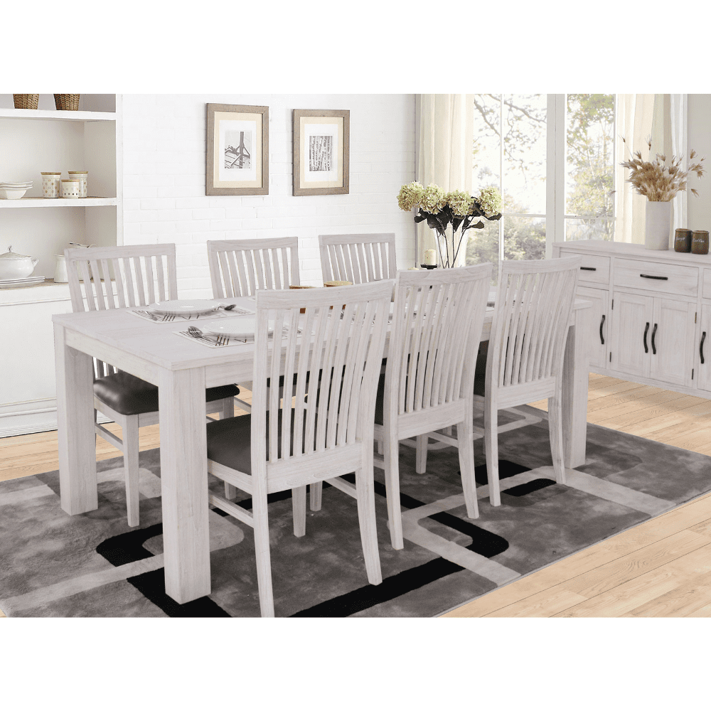 Simple and stylish, Enjoy friendly dinner parties or family gatherings with the MELDON 7PCS DINING TABLE WITH CHAIRS . The dining suite features a table crafted of solid mountain ash timber, offering a Simple, functional, contemporary design.
