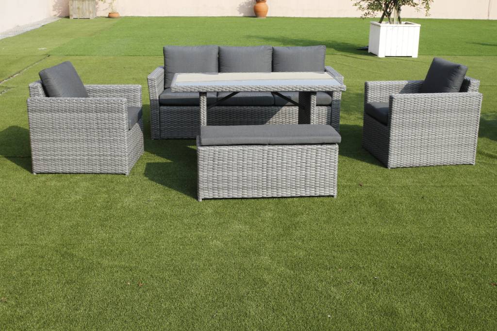 • Setting consists of a 3 seater sofa, 2 x arm chairs, a mid height dining table and a bench