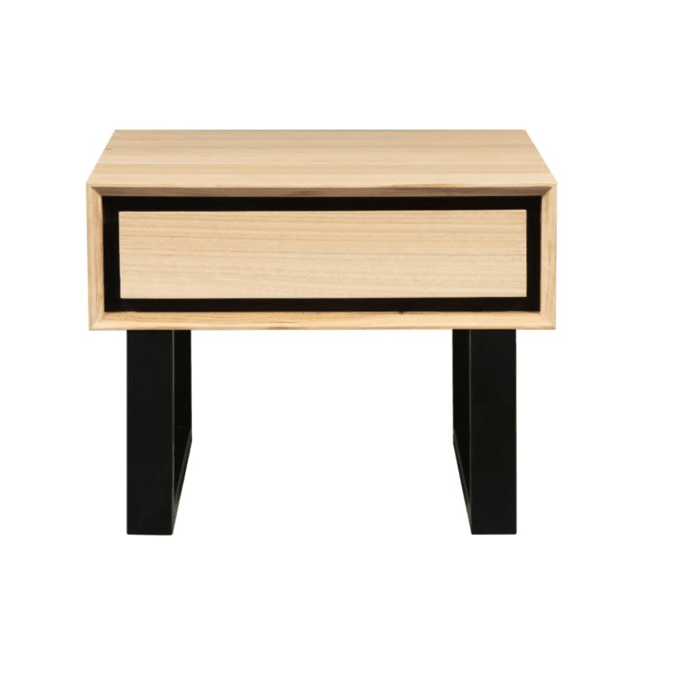• The timber is contrasted by the black powder coated metal leg frame and black shadow gap around the doors and drawers