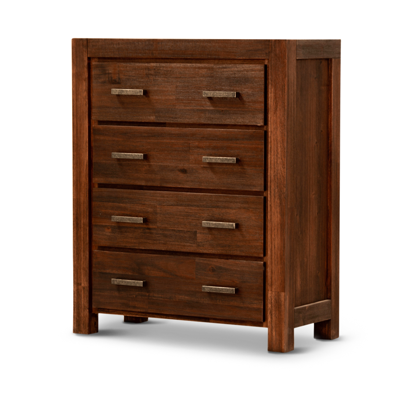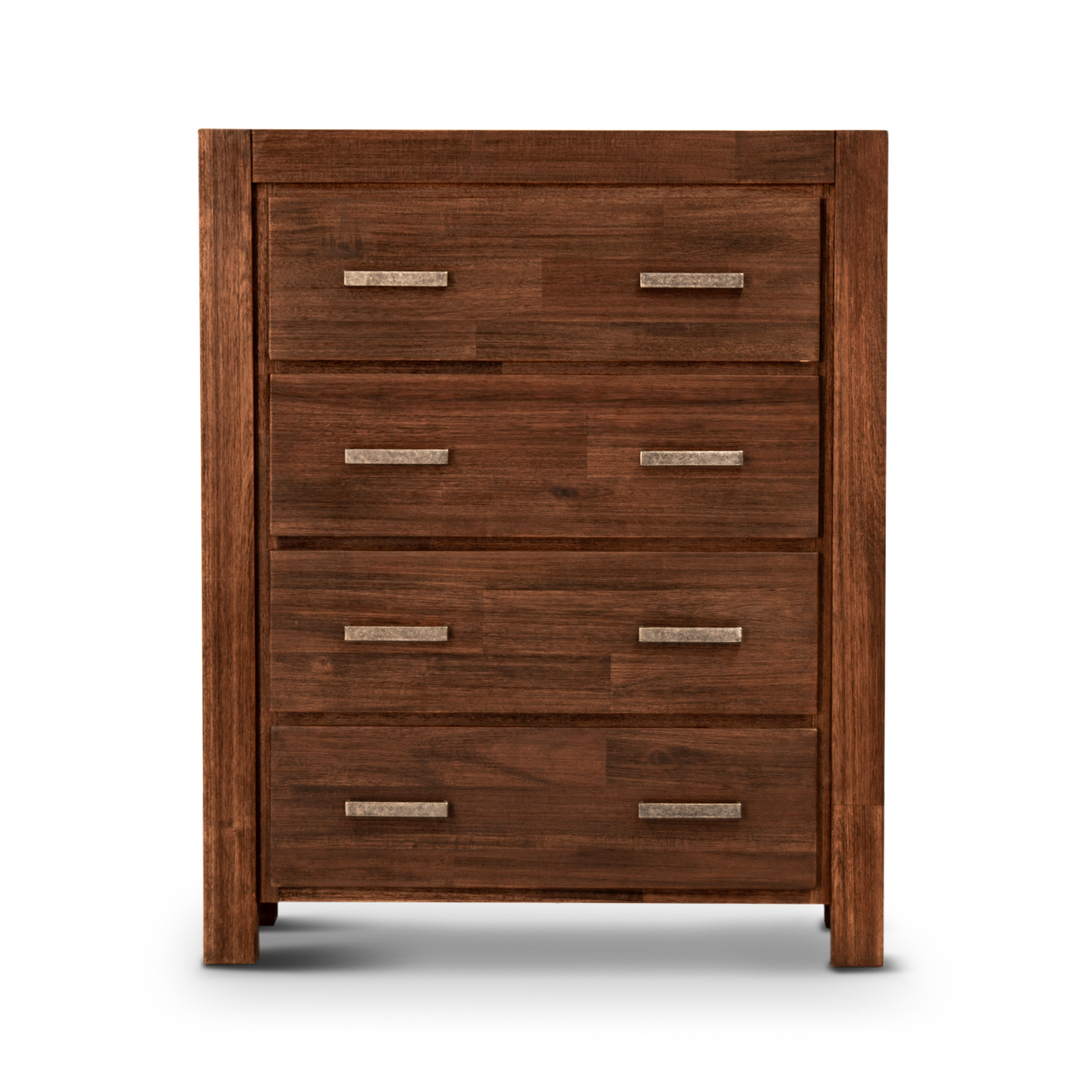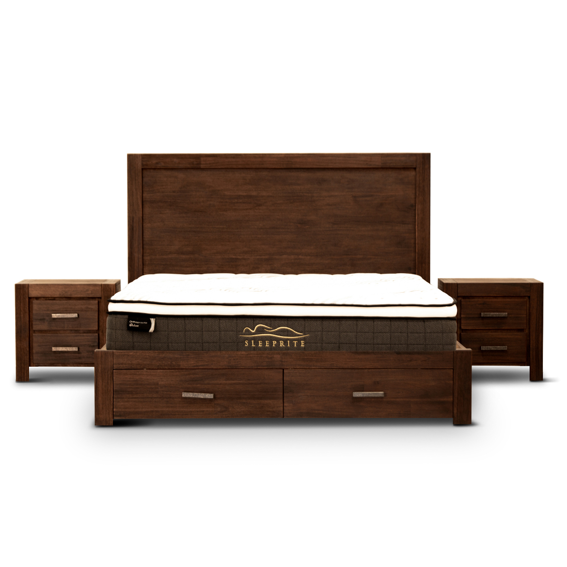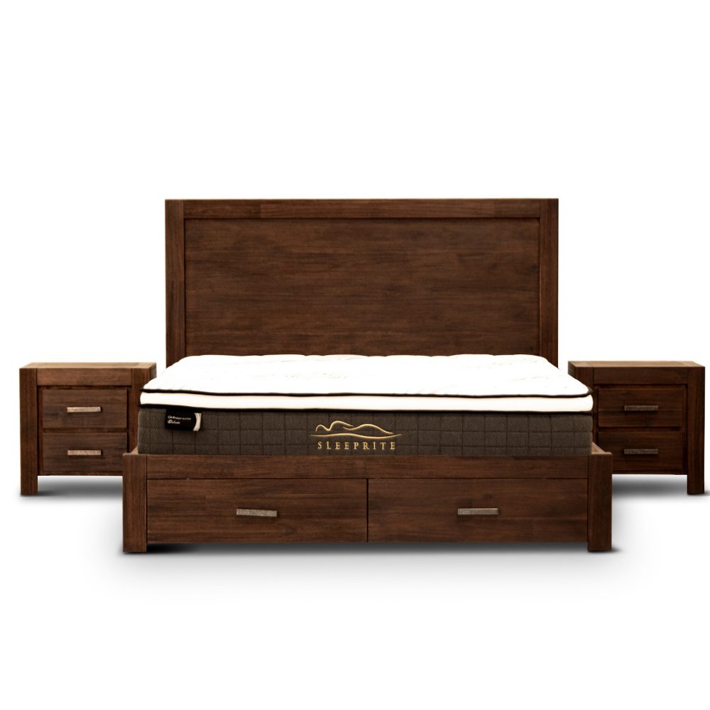 Paso 4Pcs bedroom setting including King Bedframe, 2 bed side and 1 Tallboy is a modern contemporary clean line design, featuring solid acacia timber with 2 handy drawers for extra storage . Crafted with Solid acacia side rails and slats with metal handles.