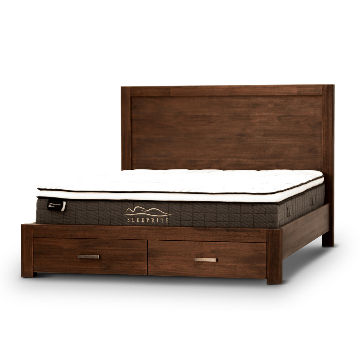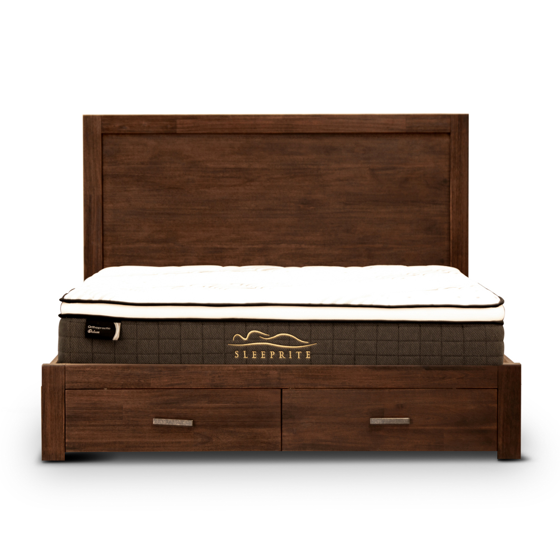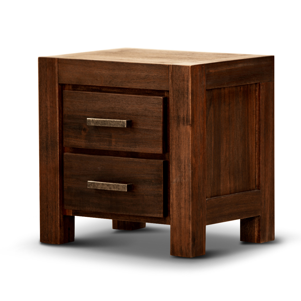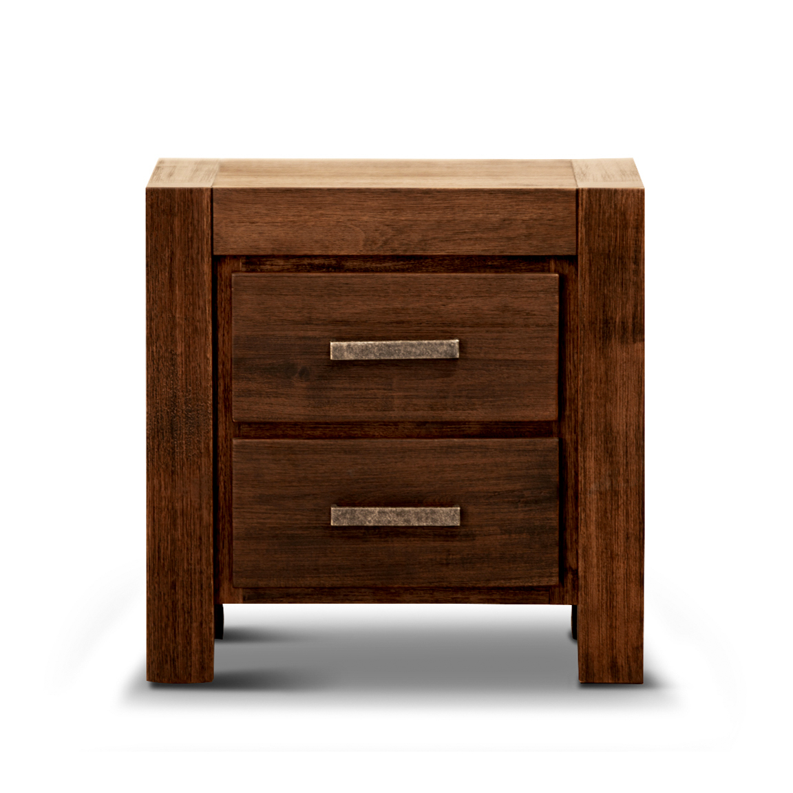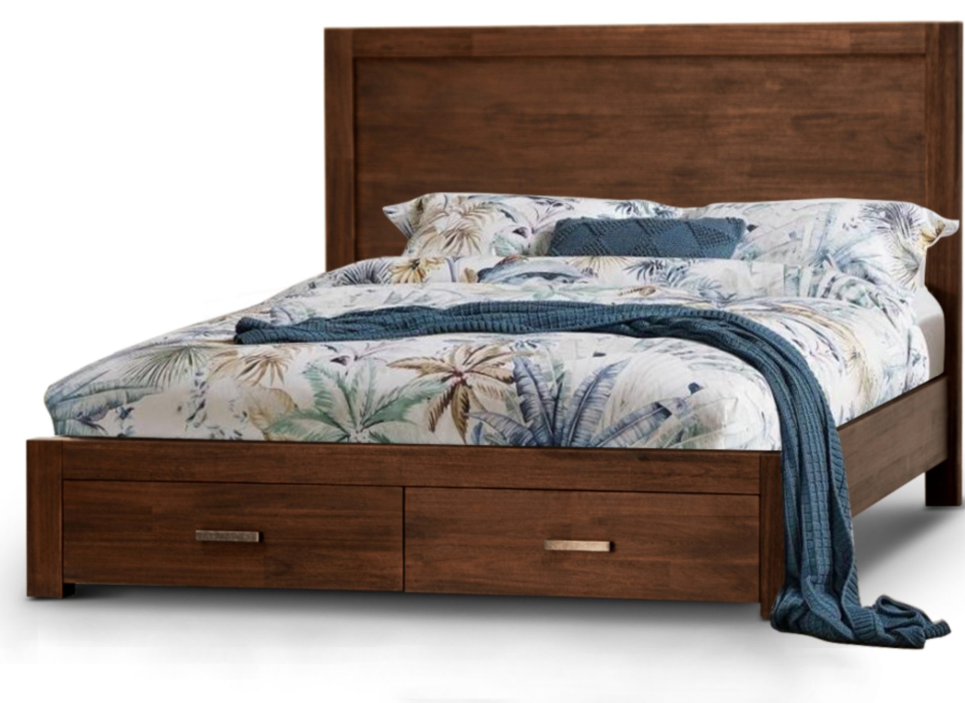 Paso 4Pcs bedroom setting including King Bedframe, 2 bed side and 1 Tallboy is a modern contemporary clean line design, featuring solid acacia timber with 2 handy drawers for extra storage . Crafted with Solid acacia side rails and slats with metal handles.