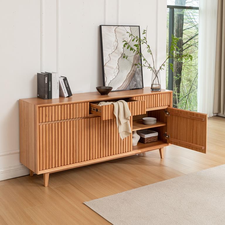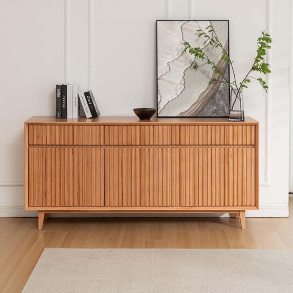 The standout feature of this dining buffet is its unique fluted design 3 door and 3 drawers, which adds a modern twist to the classic piece of dining area. The plain, smooth surface of the table provides a perfect balance to the intricately detailed leg, creating a harmonious blend of simplicity and style.