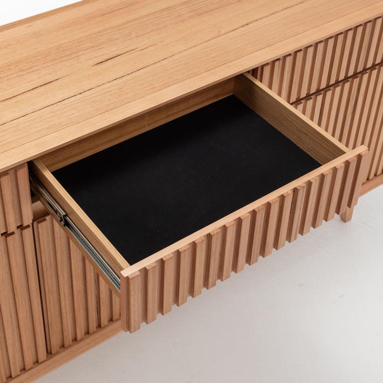 Add a touch of sophistication to your dining space with this stunning 180x45x84cm buffet, expertly crafted from high-quality Messmate wood and veneer. The table’s natural finish highlights the unique grain patterns of the wood, offering a warm and inviting aesthetic that seamlessly complements any interior decor.