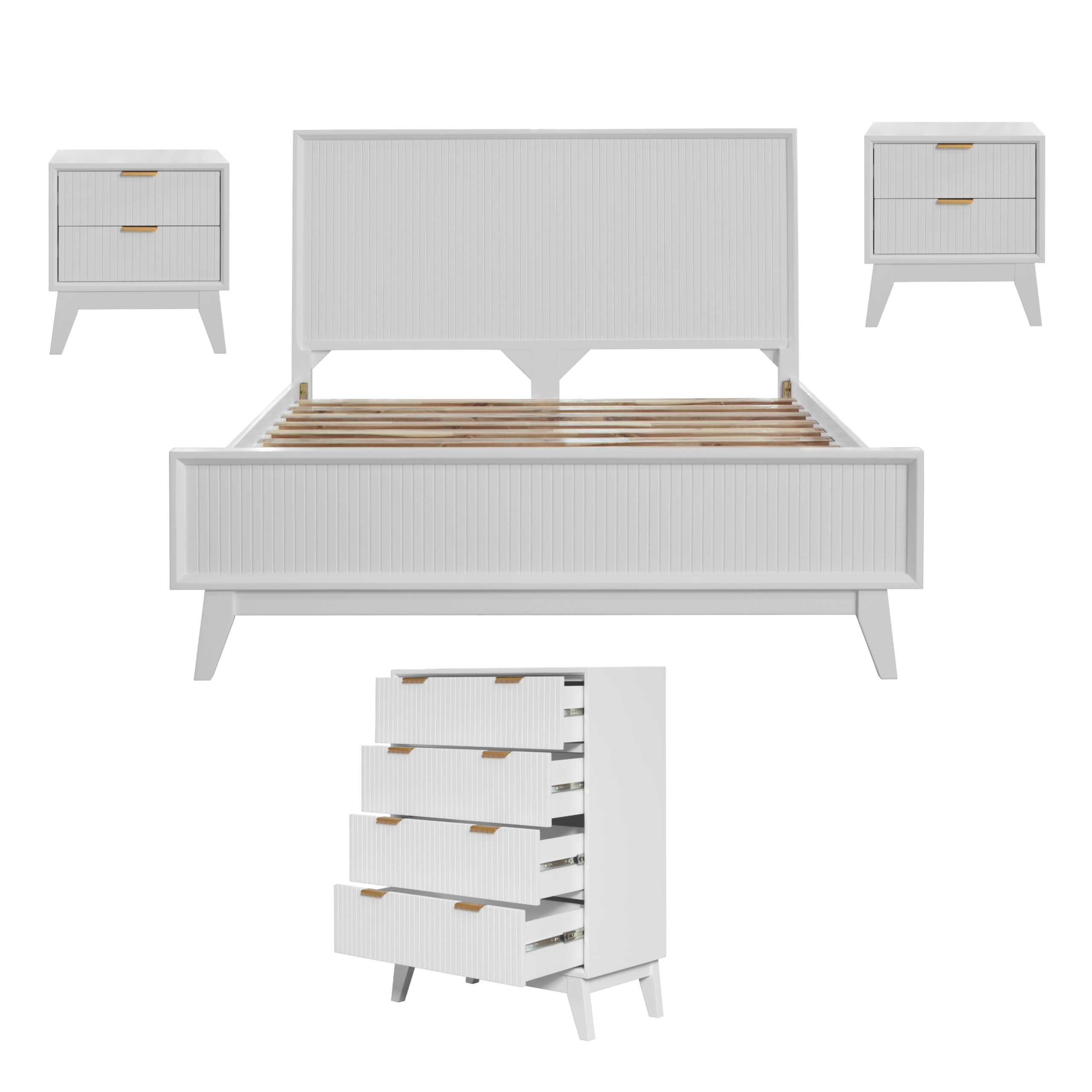 Simple and stunning, the Sasha 4pcs Queen Bed, 4 drawers Tallboy and 2 side table with 2 drawers kit in White colour has modern appeal and a certain old-fashioned charm for your bedroom area. Carefully constructed from hardwearing solid Acacia wood, and finished with brushed white paint colour.