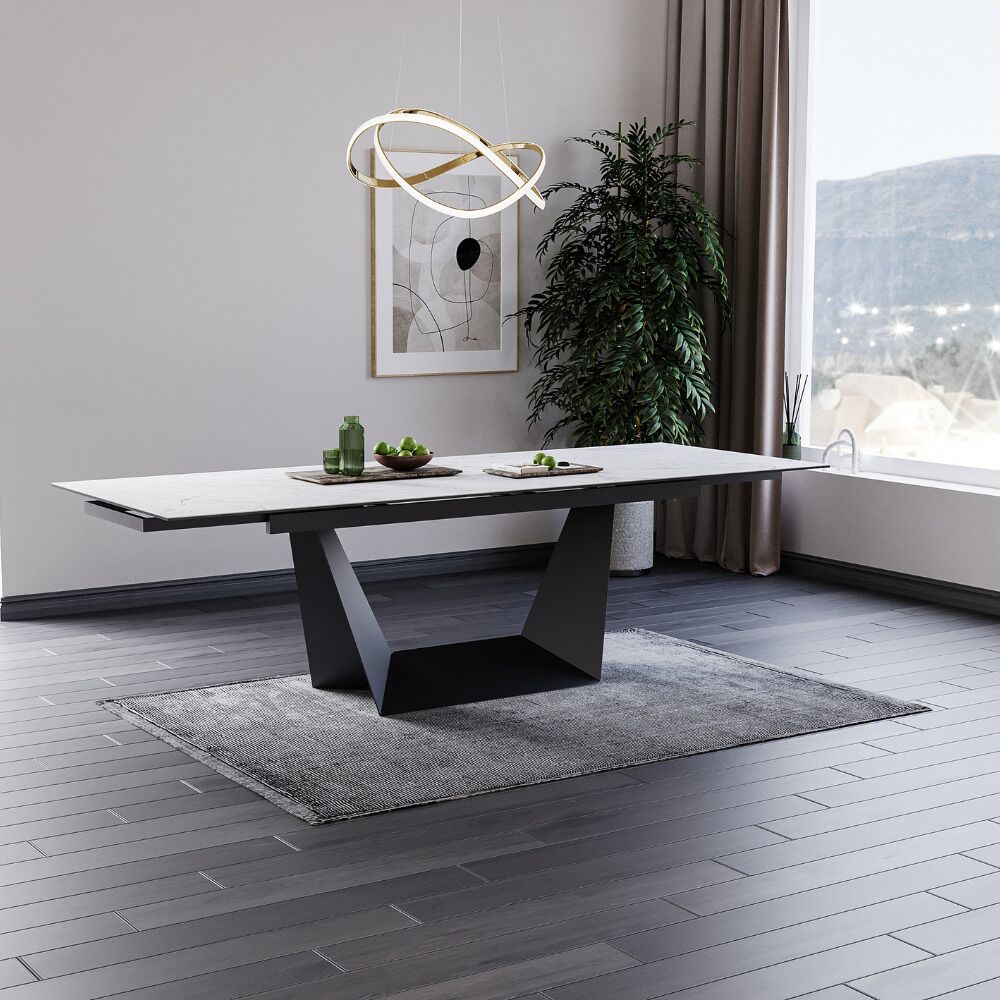 Looking for a sleek and contemporary dining table that will accommodate all of your guests? The Simpolo Extension Dining Table is the perfect choice! Featuring a beautiful Marmo Ceramic top, this table can seat up to 12 people. The best part? The end extension feature allows you to easily expand the table to fit your needs. Plus, the scratch resistant surface makes it easy to keep this table looking like new. And thanks to the black powder coated frame, this table will complement any decor style.