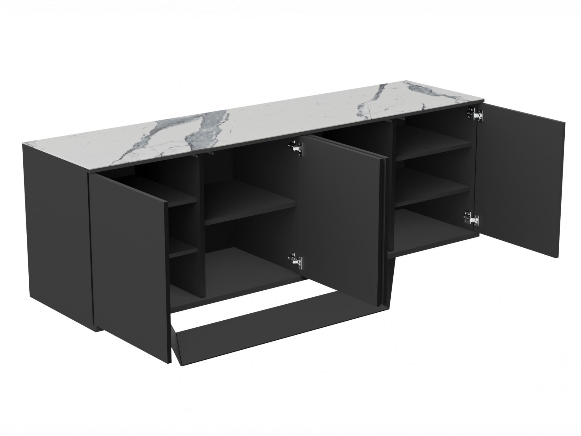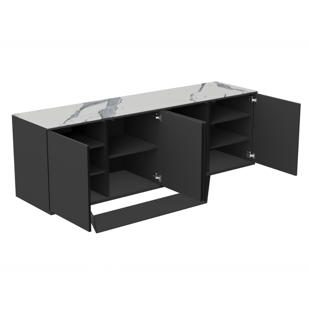 The Simpolo Sideboard is a must-have piece of furniture for any contemporary home. With a sleek finish, stylish design, and scratch-resistant top, this sideboard will look great in any living space. The MDF carcass is finished in a matt white 2 pac and the frame is black powder coated, giving the sideboard a modern look that will complement any decor. The top is made from marmo ceramics which makes it heat resistant and scratch resistant – perfect for busy families. This sideboard has plenty of storage space, making it the perfect place to store all your belongings.