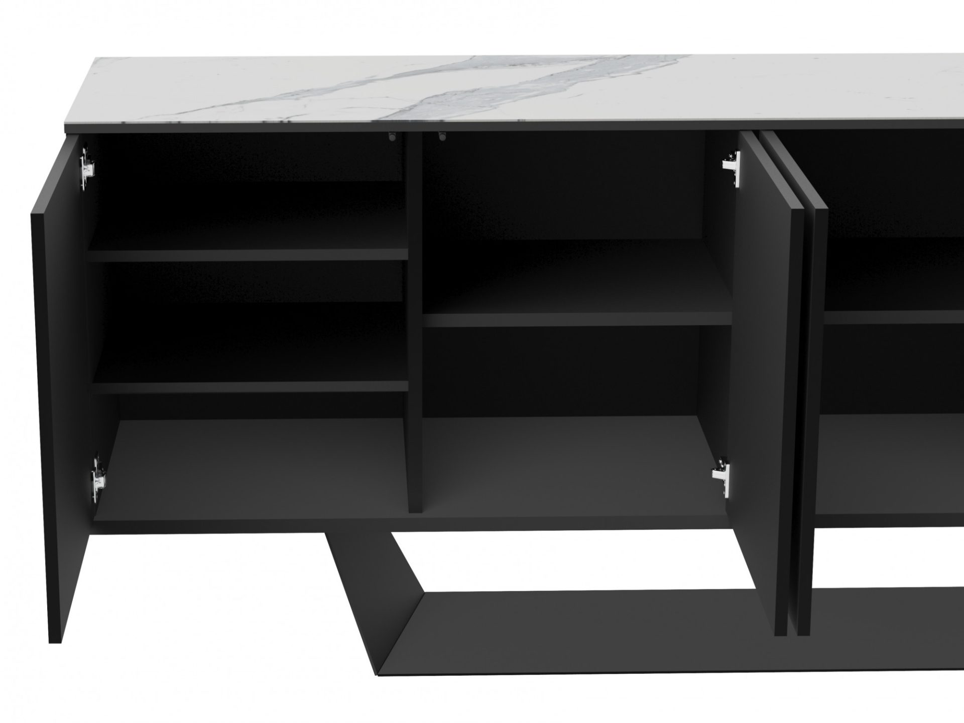The Simpolo Sideboard is a must-have piece of furniture for any contemporary home. With a sleek finish, stylish design, and scratch-resistant top, this sideboard will look great in any living space. The MDF carcass is finished in a matt white 2 pac and the frame is black powder coated, giving the sideboard a modern look that will complement any decor. The top is made from marmo ceramics which makes it heat resistant and scratch resistant – perfect for busy families. This sideboard has plenty of storage space, making it the perfect place to store all your belongings.