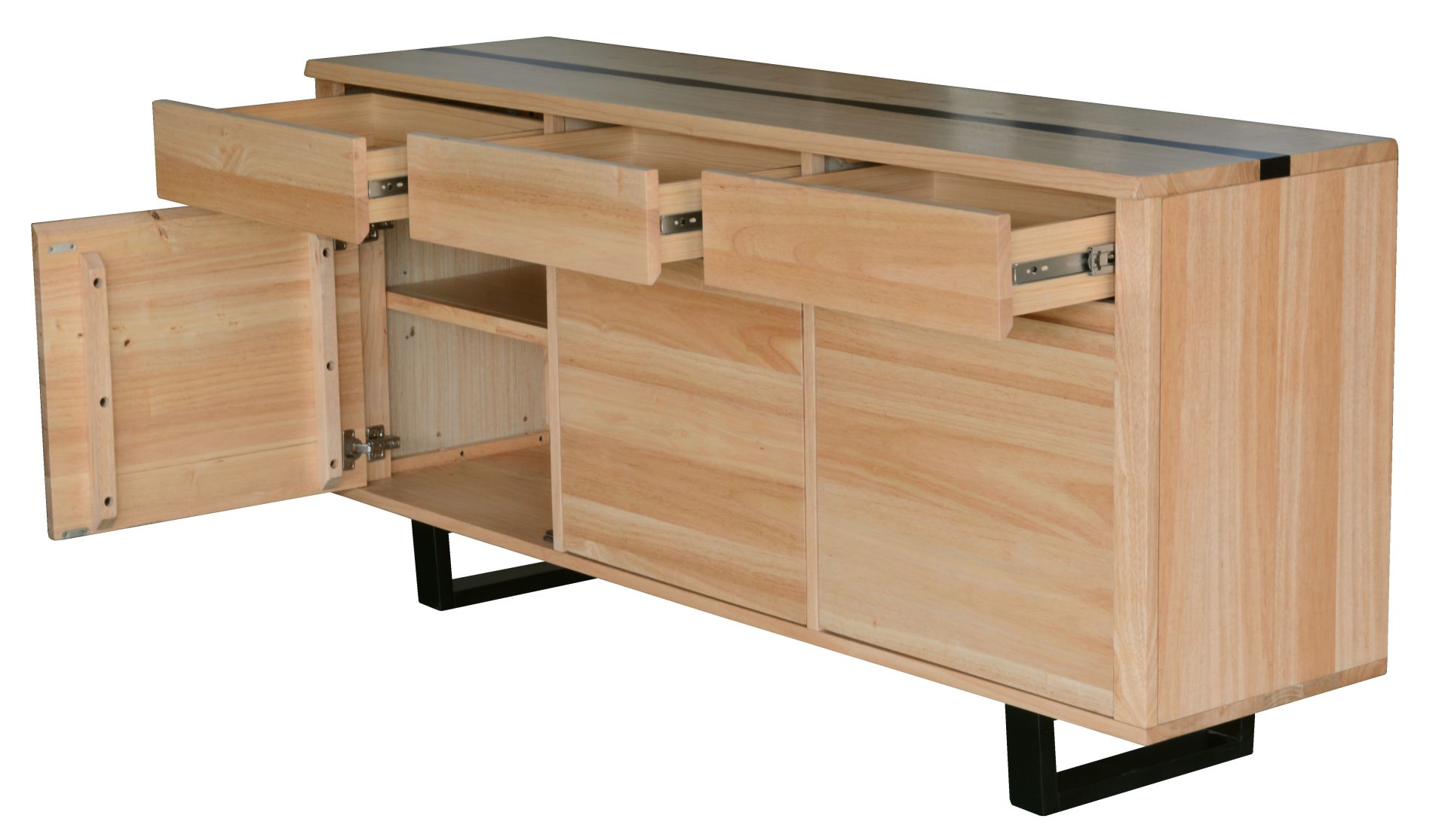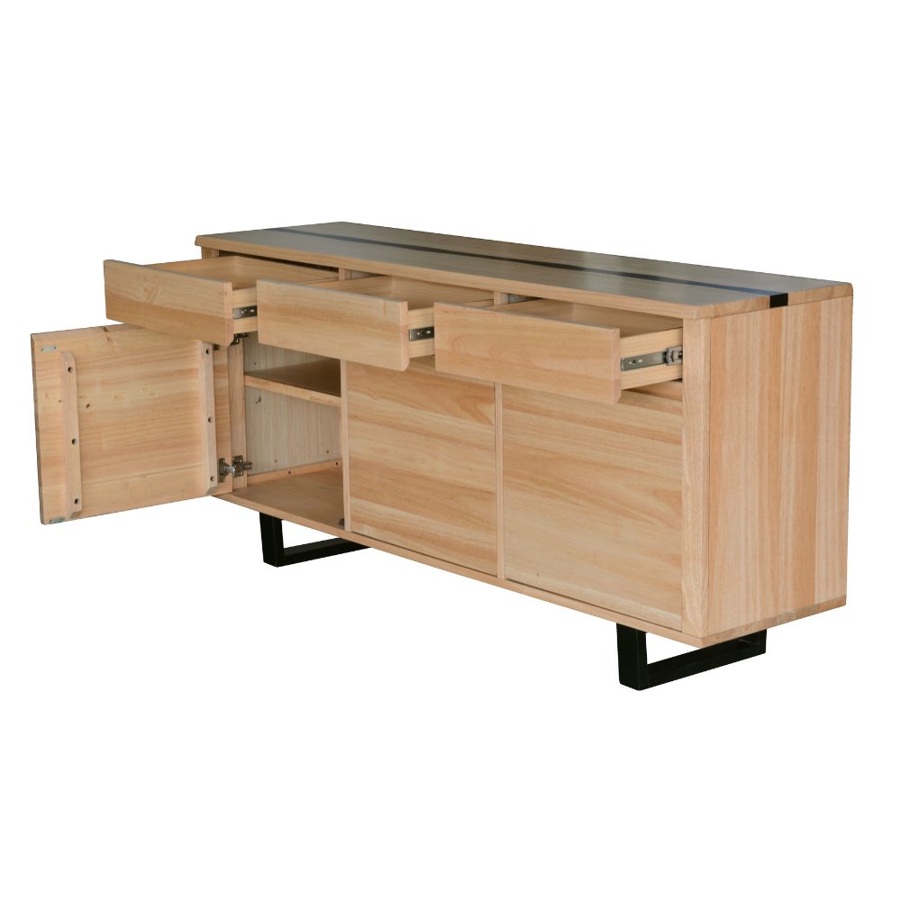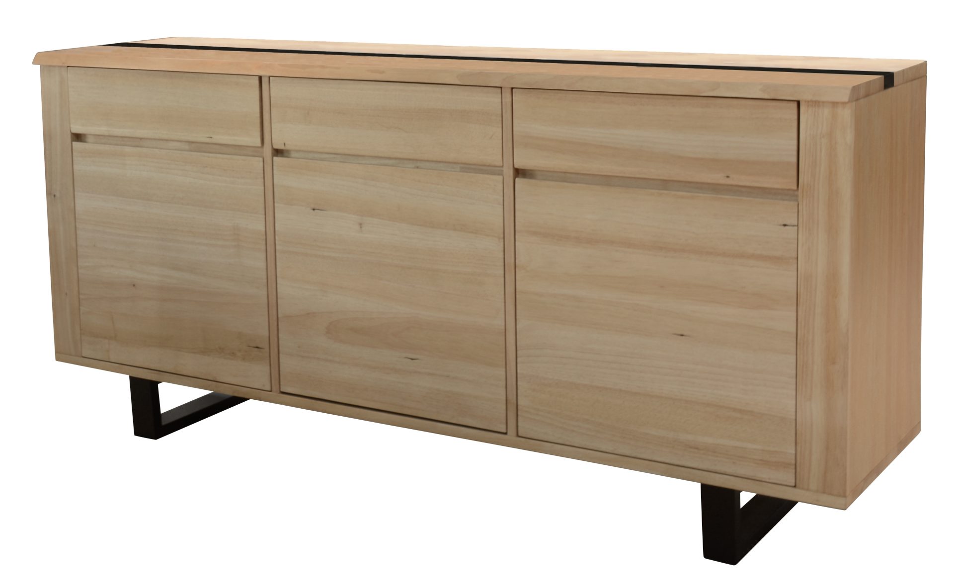 Enhance your living space with this modern yet rustic 3-door, 3-drawer buffet. The sleek, natural timber finish top adds warmth and elegance, showcasing the beauty of the wood grain. Supported by black painted ski-design legs, the buffet combines contemporary style with functionality, making it a standout piece in any room.