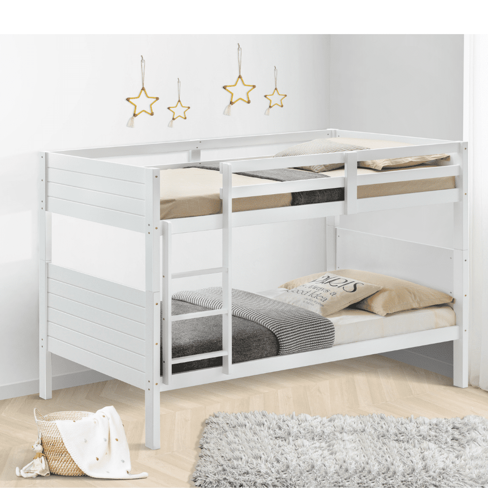 TILLY single over single bunk bed is sturdy, space-saving set of bunk beds. With a solid Rubber Wood, MDF & LVL Poplar bed frame. The bunks can be separated into separate single beds when your children grow into teenagers. Available in white colour built from premium quality pine wood, MDF, and pine veneer. Mattress are not included